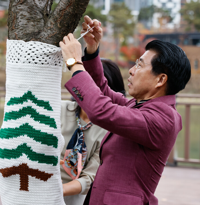 지난 8월부터 약 석 달간 60여 명의 주민 봉사단이 매주 두 시간씩 모여 뜨개 작품을 완성했다. 이들이 만든 다채로운 뜨개옷은 위례호수공원 산책로를 따라 나무 132그루에 설치돼 겨울을 앞둔 공원에 따뜻한 색감과 이야기를 더한다.