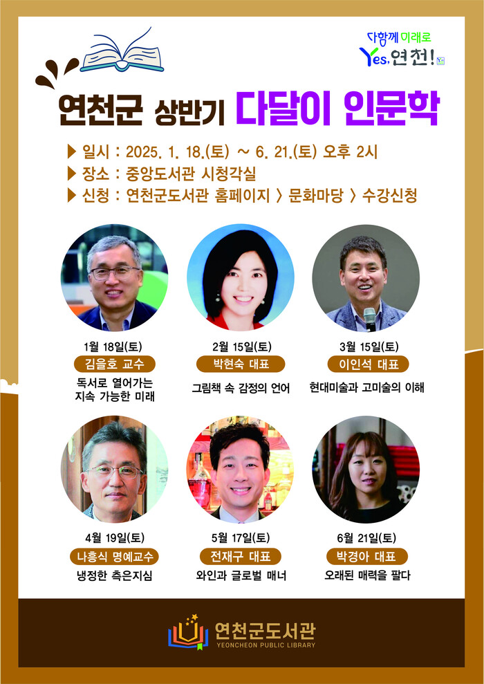 연천도서관 관계자는 “건강, 예술, 철학, 식문화 등 흥미로운 주제의 강연을 진행하여 군민들의 삶의 만족도가 향상될 것이라 기대하며, 지속적인 인문학 프로그램을 통해 군민이 보편적 문화복지를 누릴 수 있도록 노력할 것”이라며 지역 주민들의 적극적인 참여와 관심을 당부했다.