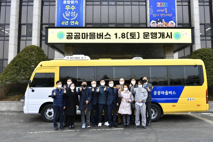 경기 김포시가 5일 북부지역 마을버스 운수업체와 공공마을버스 운행을 위한 업무협약을 체결했다. 협약으로 시는 공공마을버스 사업의 안정적인 운영을 지원하고, 마을버스 운수업체는 시민의 이동권 보장을 위해 서비스 개선 등의 역할을 맡는다. 사진은 협약식에서 정하영 시장과 관계자들이 기념촬영을 하고 있는 모습. (사진제공=김포시청)