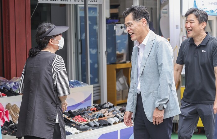 | ▲ 양천구, 목동깨비시장에서 소상공인과 이야기 나누는 이기재 양천구청장 (사진=양천구청 제공) |