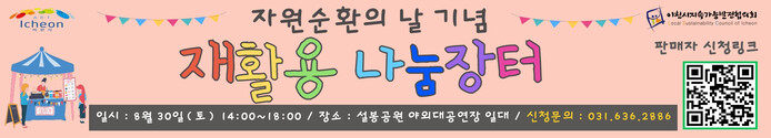 이번 장터는 이천시지속가능발전협의회가 주관으로 지구환경 보호와 자원 재활용의 중요성을 알리기 위한 ‘자원순환의 날’을 기념해 자원순환 실천을 홍보하며 업사이클링 체험 부스를 운영한다.