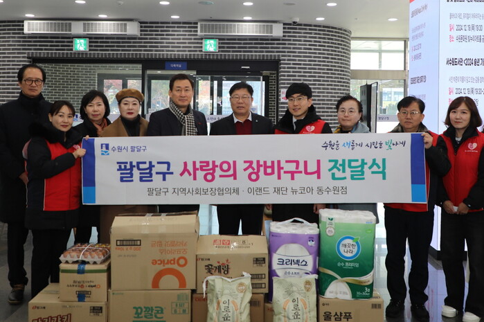 경기 수원시 팔달구가 18일, 팔달구 지역사회보장협의체, 뉴코아 동수원점과 함께 저소득 다문화가정을 위한 ‘사랑의 장바구니 전달식’을 진행했다. 사진은 전달식에 참석한 이상균 구청장 및 참석자들이 기념촬영을 하고 있는 모습. (사진=팔달구청 제공)