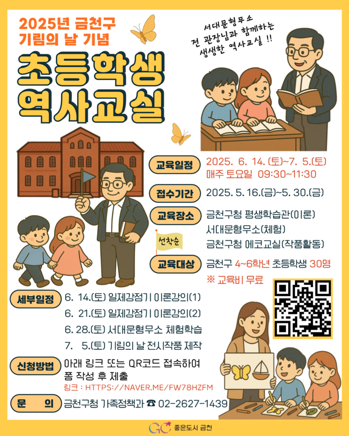 [시민일보 = 여영준 기자] 서울 금천구(구청장 유성훈)는 오는 6월14일~7월5일 매주 토요일 지역내 초등학교 4~6학년 30명을 대상으로 기림의 날 기념 ‘초등학생 역사교실’을 운영한다고 밝혔다.