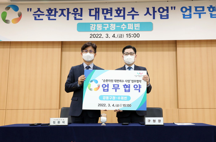 [시민일보 = 이대우 기자] 서울 강동구(구청장 이정훈)는 최근 ㈜수퍼빈과 함께 순환자원 대면회수 사업 「수퍼 모아」 업무협약을 체결했다고 밝혔다.