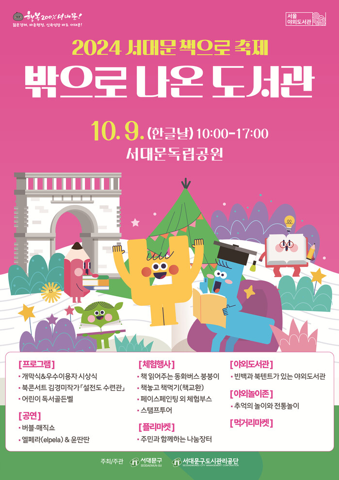 [시민일보 = 이대우 기자] 서대문구(구청장 이성헌)가 한글날인 오는 9일 오전 10시부터 오후 5시 서대문독립공원에서 ‘2024 서대문 책으로 축제’를 개최한다.