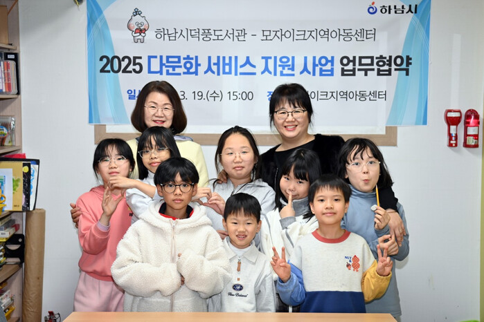 경기 하남시 덕풍도서관이 19일 모자이크지역아동센터와 업무협약을 체결하고, 다문화가정의 독서활동과 평생교육 지원을 위한 협력을 강화한다. 사진은 협약식에서 관계자 및 어린이들이 기념촬영을 하는 모습. (사진=하남시청 제공)