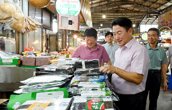 경기 의정부시는 추석 명절을 앞두고 4일 의정부제일시장에서 물가안정 간담회 및 운동(캠페인)을 실시했다. 사진은 이날 김동근 시장(오른쪽)이 물가안정 운동에 나서 의정부제일시장 상인들과 소통하고 있는 모습. (사진=의정부시청 제공)