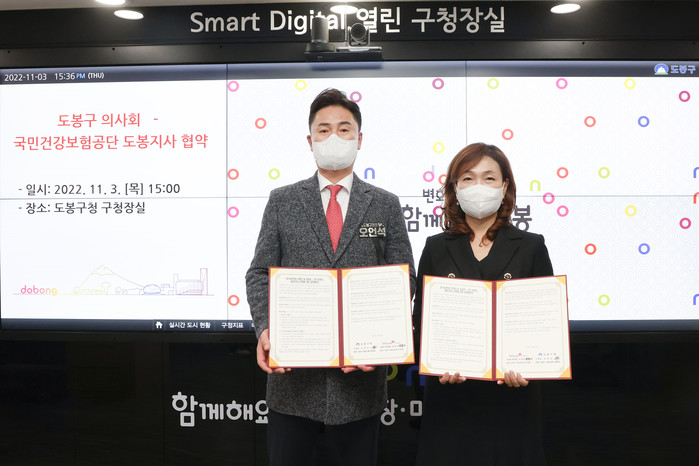 서울 도봉구가 최근 돌봄사각지대 및 위기가구 집중발굴을 위한 도봉구청·건강보험공단 도봉지사, 도봉구의사회 간 업무협약을 체결했다. 이날 협약으로 도봉구의사회는 명예사회복지공무원의 역할과 돌봄위기 질환자를 도봉구돌봄SOS센터로 연계하는 역할을 수행한다. 사진은 협약식에서 오언석 구청장(왼쪽)과 국민건강보험공단 도봉지사 박정미 지사장직무대리가 기념촬영을 하는 모습. (사진제공=도봉구청)