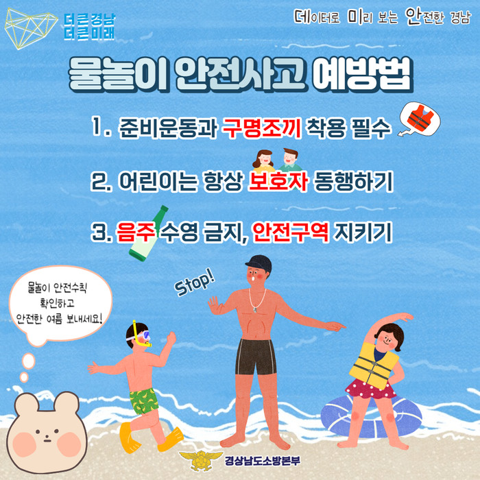 여름철에는 휴가 등으로 외부활동이 증가하고 익숙하지 않은 타지에서 물놀이를 즐기는 경우가 많아 예상하지 못한 사고의 우려가 있다. 이에 물놀이 안전사고 예방을 위해 안전수칙 준수 등 각별한 주의가 필요하다.