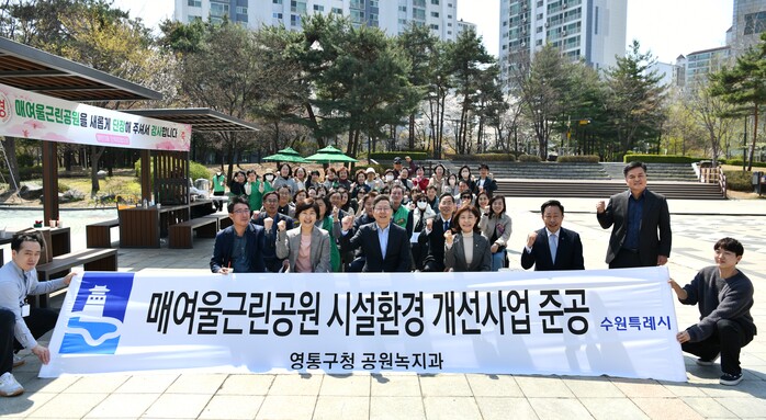 경기 수원시 영통구가 8일 매탄3동에 위치한 매여울공원에서 ‘매여울근린공원 시설환경 개선사업 준공식’을 개최했다. 사진은 준공식에 참석한 박사승 구청장(앞줄 가운데) 및 참석자들이 기념촬영을 하고 있는 모습. (사진=영통구청 제공)