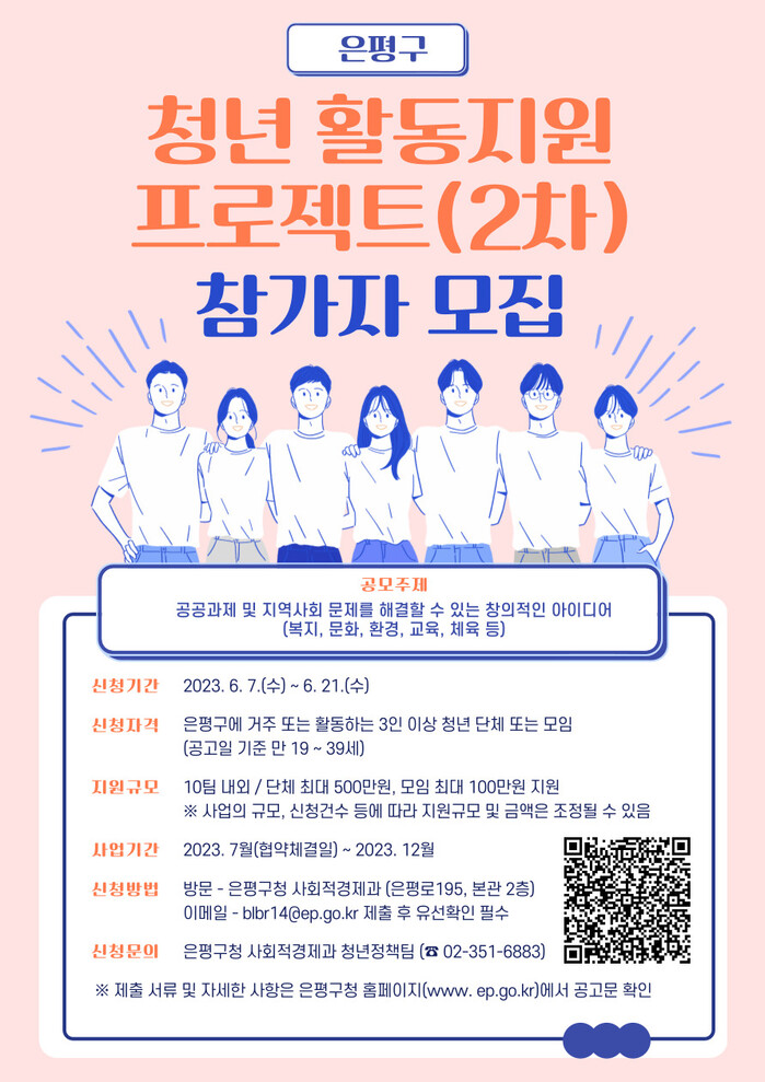 지원 자격은 은평에 거주하거나 은평을 기반으로 활동하는 만 19세 이상 39세 이하 청년 3인 이상으로 구성된 단체나 모임이다.