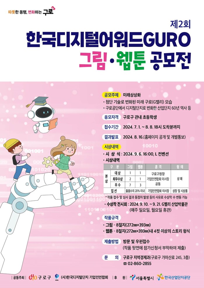 올해는 그림과 웹툰 2개 부문에 걸쳐 ▲첨단기술로 변화된 미래 구로(G밸리) 모습 ▲구로공단에서 디지털단지로 변화한 산업단지 60년 역사를 주제로 진행된다.