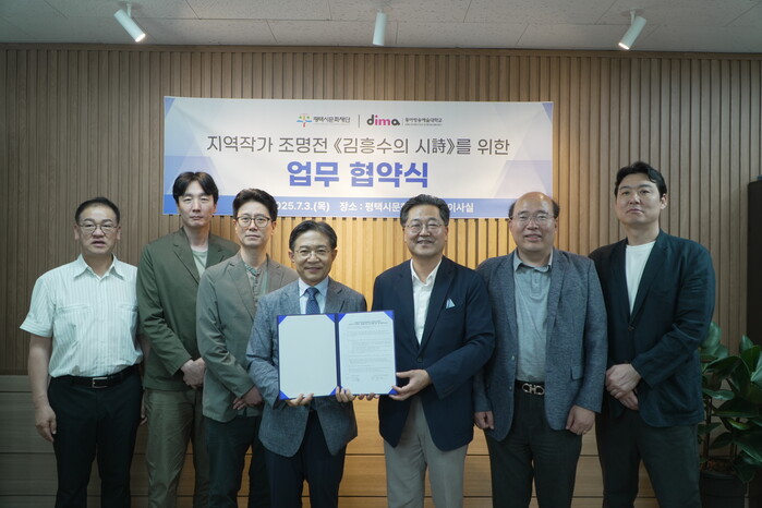 [평택=오왕석 기자] (재)평택시문화재단(대표이사 이상균)과 동아방송예술대학교(총장 이상길)는 7월 3일(목) 오후 1시 30분, 평택시문화재단 대표이사실에서 지역작가 조명전 《김흥수의 시詩》 개최 및 문화예술 교류 활성화를 위한 업무협약(MOU)을 체결했다.