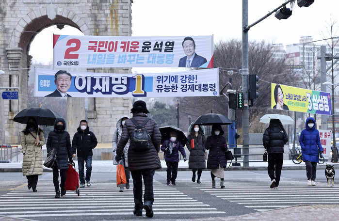 제20대 대통령 선거의 공식선거운동이 시작된 15일 오전 서울 독립문역 사거리에서 시민들이 횡단보도를 건너고 있다. (사진제공=연합뉴스)