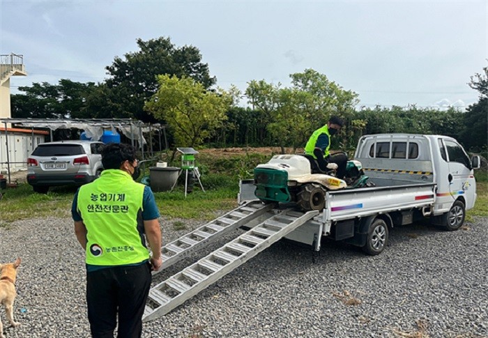 | ▲ 영암군농업기술센터 농기계임대사업소 관계자가 관내 농가에서 임대한 농기계를 화물트럭에 승차 시키고 있다. / 영암군 제공 |
