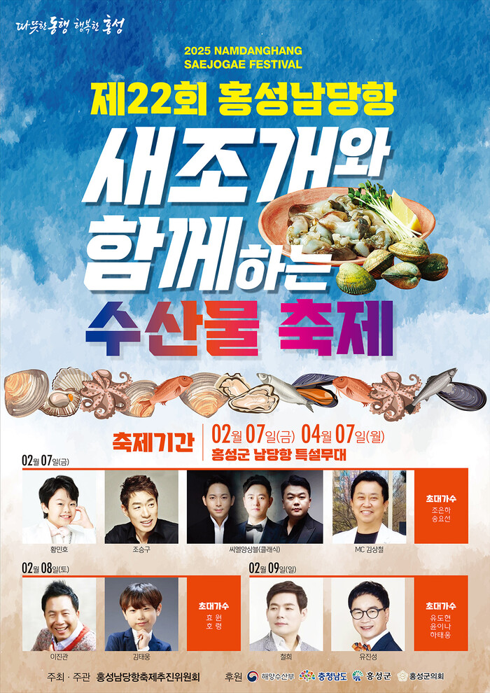한편 지난 2024년 폭염으로 새조개 생산량이 대폭 감소하면서 이번 새조개의 가격이 급등해 어민들과 상인들의 근심이 깊어지던 참에, 올해는 ‘새조개와 함께하는 수산물 축제’로 지역과 축제추진위원회가 함께 의기투합해 새조개를 포함한 남당항의 수산물 소비 촉진과 지역경제 활성화에 이바지할 것으로 기대된다.