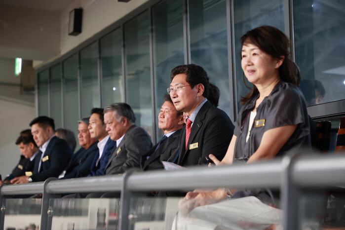 | ▲ 15일 용인미르스타디움에서 이상일 시장이 정몽규 회장, 미즈시마 고이치 대사 등과 경기를 관람하고 있다. |