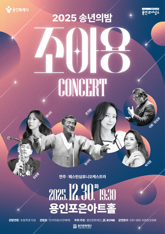 올해 초 리모델링을 마치고 새롭게 문을 연 용인포은아트홀은 다채로운 장르의 공연을 선보이며 지역 대표 공연장으로 자리매김해 왔다. 이번 송년 콘서트는 한 해 동안 용인포은아트홀을 찾아준 용인 시민에게 감사의 마음을 전하고, 지역 예술인과 함께 2025년을 마무리하며 희망찬 2026년을 맞이하고자 기획되었다.
