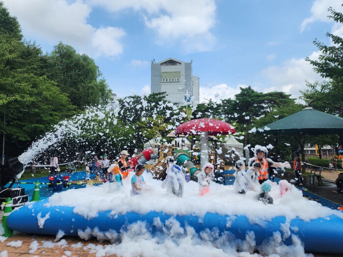 | ▲ 덕의근린공원 작은 수영장(미니 풀장)에서 거품놀이를 하며 즐거운 시간을 보내는 아이들. (사진=구로구청 제공) |