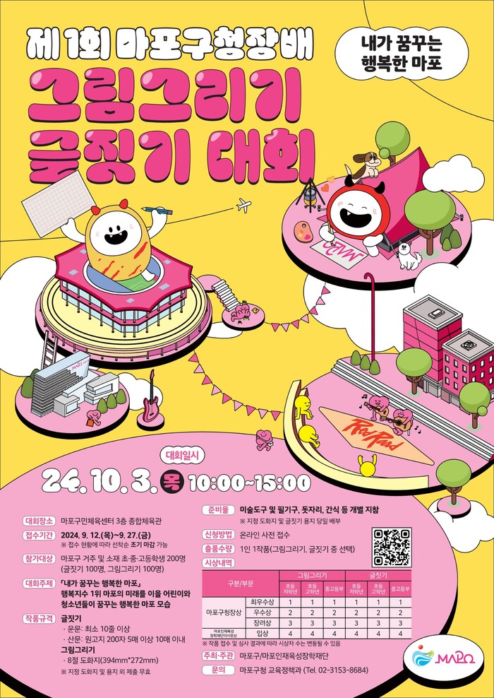 이번 대회는 오는 10월3일 마포구민체육센터 3층 종합체육관에서 열리며, 어린이와 청소년이 꿈꾸는 ‘행복한 마포’를 주제로 열린다.