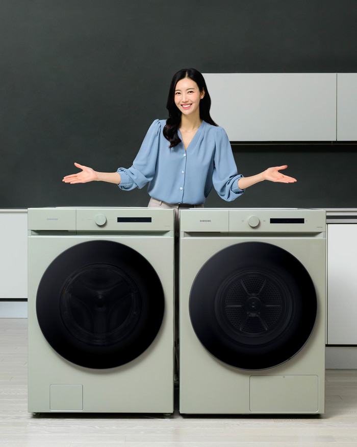 | ▲ 삼성전자 모델이 '비스포크 그랑데 AI' 세탁기와 건조기 신제품을 소개하고 있는 모습.(사진제공=삼성전자) |