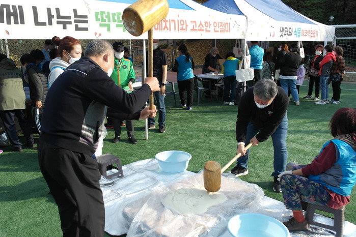 경기 안산시 단원구 선부2동 주민자치위원회가 최근 석수골운동장, 샛터공원에서 ‘샛터의 사계 작은 축제’를 개최했다. 이날 축제에서는 국악·판소리 공연 및 떡메치기를 통해 우리 전통문화를 체험하고 에코백 만들기 등 체험 프로그램을 진행했다. 사진은 이날 주민들이 떡메치기 체험을 하고 있는 모습. (사진제공=안산시청)