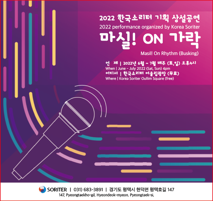[평택=오왕석 기자] 평택시문화재단(대표이사 이상균)은 6월 11일(토) ~ 7월 31일(일) 매주(토, 일) 오후 4시 한국소리터 어울림광장에서 한국소리터 상설공연 2022 <마실 ! On 가락>의 문화의 장을 연다.