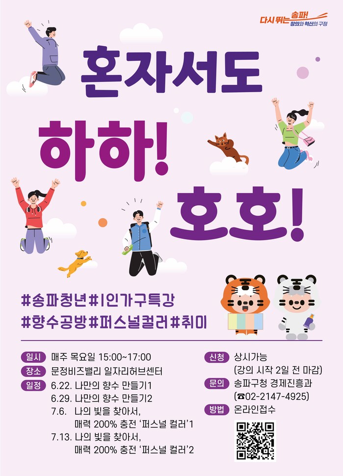 특강은 송파구에 거주하는 청년(만 19~39세) 1인가구이면 누구나 참여할 수 있다. 모집 정원은 각 강의당 20명으로 강의 시작일 2일 전까지 선착순으로 접수 받는다. 상세 일정은 송파구청 홈페이지나 문정비즈밸리 일자리허브센터 홈페이지에서 확인할 수 있다.