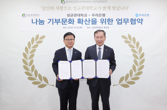 [시민일보 = 홍덕표 기자] 우리은행은 지난 20일 성균관대학교와 나눔 기부문화 확산을 위한 ‘우리내리사랑 신탁서비스 공동마케팅 업무협약’을 체결했다.