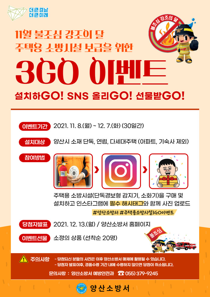 설치대상은 아파트, 기숙사를 제외한 양산시 소재 단독, 연립, 다세대 주택이며, 참여방법은 주택용 소방시설(단독경보형 감지기·소화기)을 구매 및 설치 후 인스타그램에 필수 해시태그(#양산소방서 #주택용소방시설3GO이벤트)와 함께 인증사진을 업로드하면 된다.