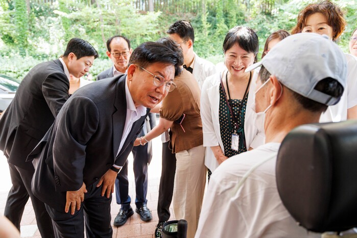 | ▲ 지난해 7월 마포구장애인종합복지관에서 개최한 휠피 바자회에 참석해 주민과 인사를 나누는 박강수 구청장 (사진=마포구청 제공) |