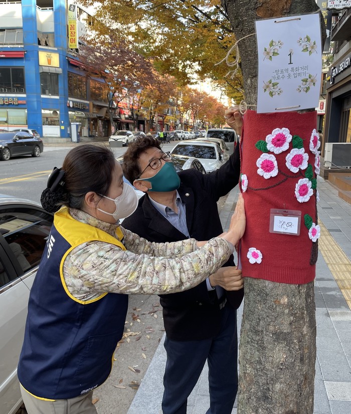 경기 수원시 영통구 영통2동 마을공동체 벽적골자봉이가 최근 ‘망포역 특화거리 가로수 옷입히기’ 공식 행사를 열고 지역내 망포역 특화거리 340m 구간 가로수 60그루에 직접 제작한 가로수 옷을 입혔다. 사진은 관계자들이 가로수에 옷 입히기를 시연하고 있는 모습. (사진제공=수원시 영통구청)