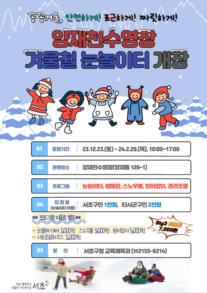 이번에 개장하는 양재천수영장 겨울철 눈 놀이터는 기존 수영장 시설과 공간을 활용해 ▲어린이와 가족을 위한 시설 ▲도심에서 즐기는 겨울 체험(눈썰매, 눈놀이터, 빙어잡이, 스노우볼) ▲안전하고 쾌적한 운영 등이 특징이다.