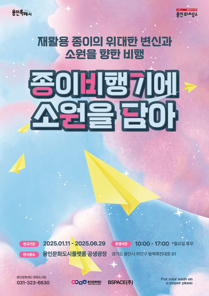 [용인=오왕석 기자] 용인문화재단(이사장 이상일)은 1월 11일부터 6월 29일까지 ESG 경영의 일환으로 자원순환 참여형 전시 ‘종이비행기에 소원을 담아’ 를 용인문화도시플랫폼 공생광장(이하 ‘공생광장’)에서 개최한다.