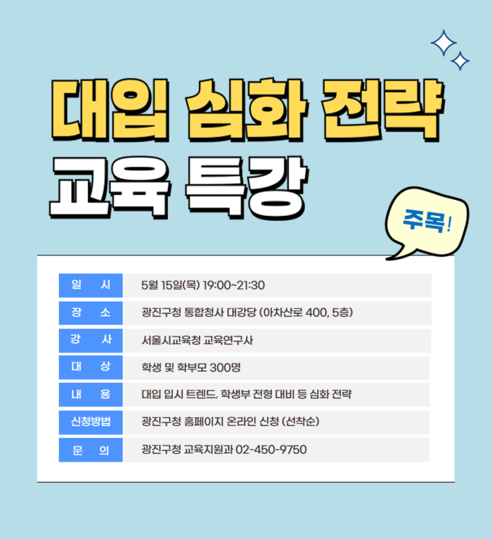 [시민일보 = 여영준 기자] 광진구(구청장 김경호)가 5월15일, 새로 들어선 광진구 통합청사 5층 대강당에서 ‘2025년 대입 심화전략 교육특강’을 개최한다.