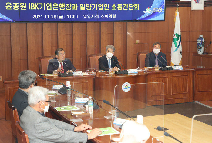 밀양시(시장 박일호)와 밀양상공회의소(회장 손영준)는 19일 시청 소회의실에서 윤종원 기업은행장을 초청해 국내외 경제동향 및 ESG경영에 대하여 공유하고, 지역 발전을 위한 상호 의견을 나누는 기업인 소통 간담회를 개최했다.