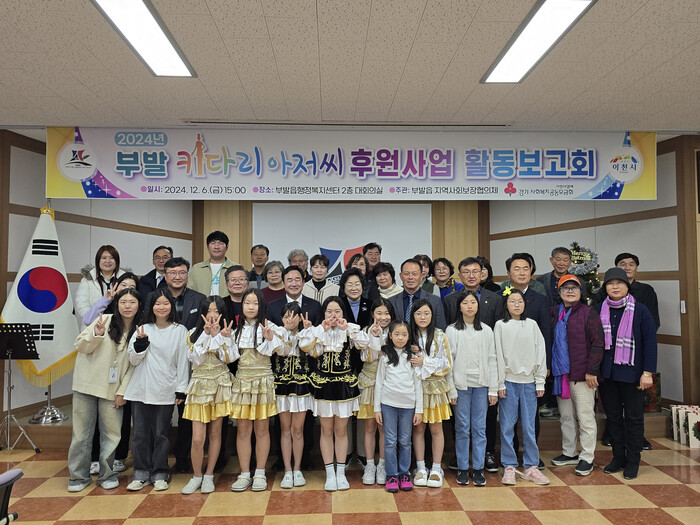 경기 이천시 부발읍 지역사회보장협의체가 최근 부발읍 행정복지센터 2층 대회의실에서 2024년의 활동을 돌아보는 ‘키다리아저씨 후원사업 활동보고회’를 개최했다. 사진은 보고회에 참석한 김경희 시장(두 번째 줄 가운데)과 관계자들이 기념 촬영을 하고 있는 모습. (사진=이천시청 제공)