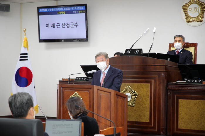 이재근 군수는 “코로나19 장기화 여파로 민생경제와 중·소상공인의 어려움이 가중되고 있다. 우리 군은 위기를 기회로 만들기 위해 산청형 재난지원금과 소상공인 희망회복자금 등을 신속히 지급해 경제회복과 생활안정에 기여했다”며 “또 우리 군이 다시 한번 도약하는 성장동력이 될 2023엑스포 개최를 확정지었다”고 설명했다.