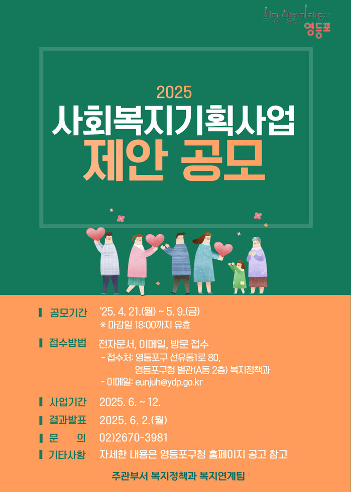 [시민일보 = 여영준 기자] 영등포구(구청장 최호권)가 현장 중심의 참신하고 실효성 있는 복지 프로그램 발굴을 위해 ‘사회복지 기획사업’ 제안 공모를 오는 5월 9일까지 진행한다고 밝혔다.