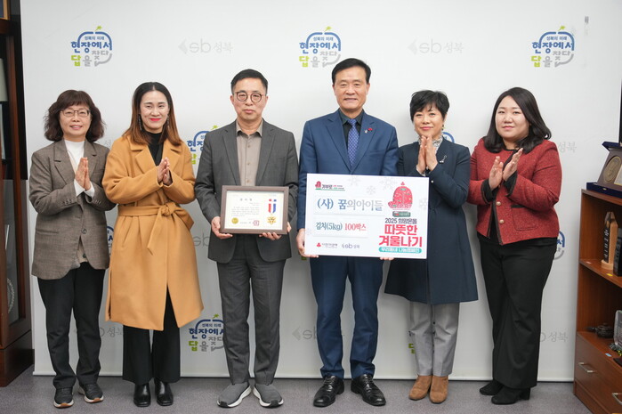 서울 성북구는 최근 사단법인 꿈의아이들이 어려웃 이웃을 돕기위한 김장 김치(5kg, 100박스)를 기탁했다고 밝혔다. 사진은 성품 전달식에 참석한 이승로 구청장(오른쪽 세 번째)과 관계자들이 기념촬영을 하고 있는 모습. (사진=성북구청 제공)