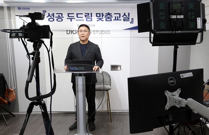 | ▲ 8일 서울 중구 소재 신한은행 서소문 디지로그 스튜디오에서 진행된 ‘성공 두드림 맞춤교실’ 중 경기테크노파크 김태호 책임연구원이 컨설팅하는 모습(사진=신한은행 제공) |