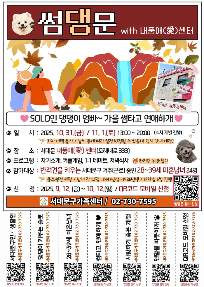 [시민일보 = 이대우 기자] 서울 서대문구(구청장 이성헌) 서대문구가족센터가 오는 10월31일, 11월1일 서대문 내품애(愛)센터(모래내로 333)에서 반려견을 키우는 미혼남녀 만남 행사 ‘썸댕문 with 내품애센터’를 개최한다.