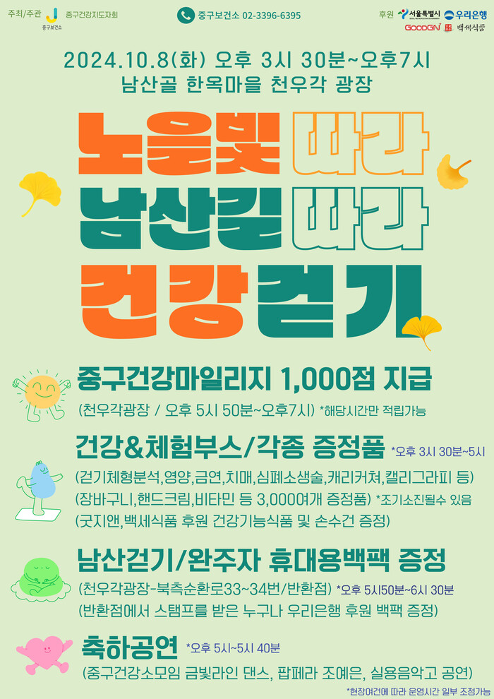 [시민일보 = 여영준 기자] 서울 중구는 오는 10월 8일 남산골 한옥마을 천우각 광장을 시작으로 남산 북측순환로 일대에서 건강 걷기 행사를 진행한다고 밝혔다.