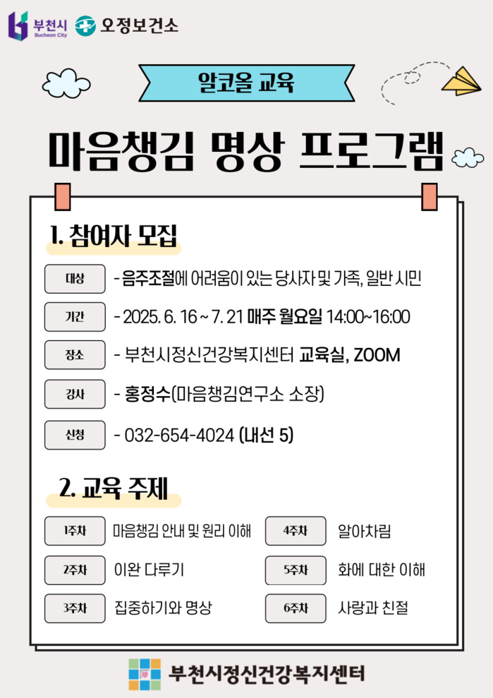 신청은 부천시정신건강복지센터를 통해 가능하며, 교육 일정과 줌(ZOOM) 접속 링크는 문자로 안내된다.