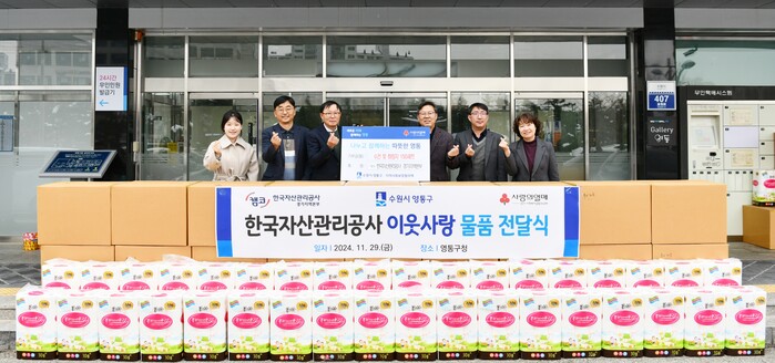 최근 한국자산관리공사 경기지역본부가 취약계층 지원을 위한 300만원 상당의 물품을 경기 수원시 영통구에 기탁했다. 후원한 물품은 수건과 화장지(30롤) 각각 150세트이다. 사진은 전달식에 참석한 박사승 구청장(왼쪽 네 번째)과 참석자들이 기념촬영을 하고 있는 모습. (사진=영통구청 제공)