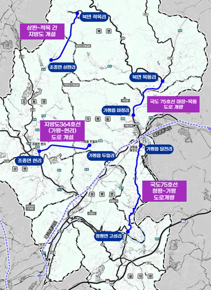 최근 개통한 ‘국도 75호선 가평 달전지구 위험도로 개선공사’는 경기도에서 124억원의 예산을 투입해 기존 2차로 도로를 4차로로 확장하고, 625미터 구간의 선형을 보완했다. 아울러, 경기도가 140억원의 예산을 투입한 ‘국도 75호선 가평 복장지구 위험도로 개선공사’도 올해 완공됐다. 또한 군은 가평~현리 및 상판~적목 간 지방도 사업에 대한 시급성과 필요성을 적극 피력한 결과, ‘경기북부특별자치도 도로분야 전략사업’으로 선정되는 등 가시적인 성과를 거뒀다.