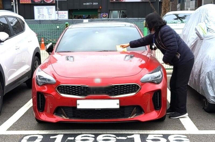 | ▲ 거주자 우선주차구역 내 무단주차 차량에 단속 예고장을 부착하고 있는 모습. (사진=영등포구청 제공) |