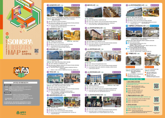 지도에는 위치 외에도 도서관 운영시간, 찾아가는 길, 주요 편의시설 등 주요 안내 사항과 송파구 통합도서관 사이트, 송파구 전자도서관 및 접속 QR 코드 등을 상세하게 기재하였다. 주민뿐만 아니라 도서관을 처음 접하는 누구나 한눈에 필요한 정보를 얻을 수 있다.