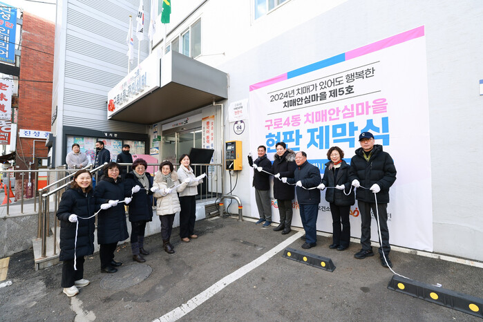 서울 구로구가 3일 구로4동 주민센터에서 보건소장, 구로4동 치매안심마을 운영위원회 위원 등이 참석한 가운데, ‘구로4동 치매안심마을 현판식’을 개최했다. 사진은 현판식 참석자들이 기념 촬영하는 모습. (사진=구로구청 제공)