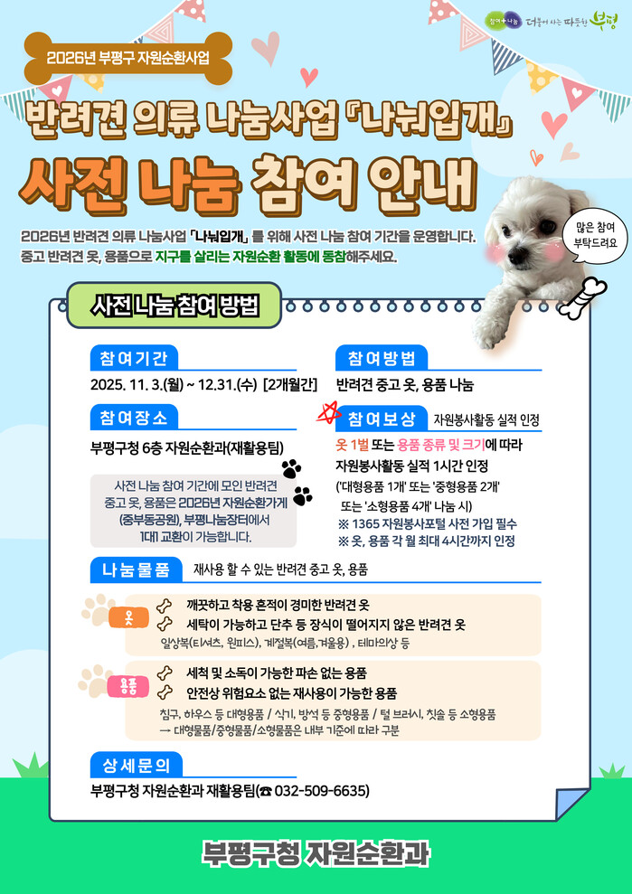 [인천=문찬식 기자] 인천 부평구가 2026년에 개최 예정인 반려견 의류 나눔사업 ‘나눠입개’에 앞서 ‘사전 나눔 참여 기간’을 운영한다.